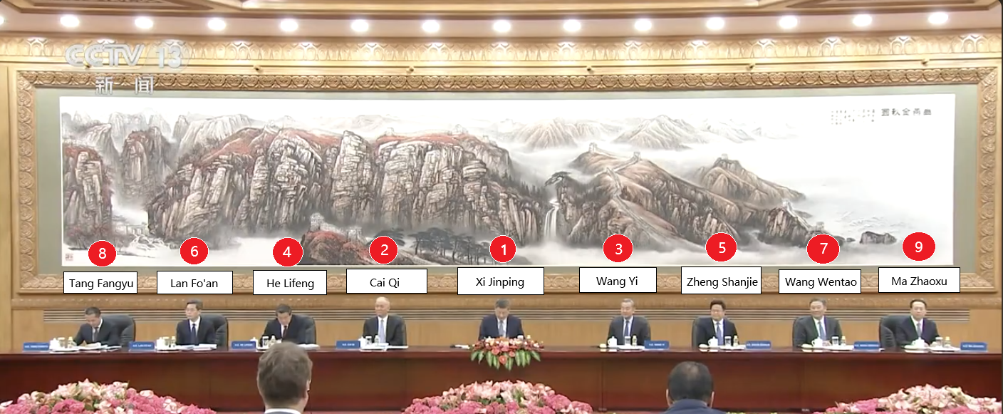 The image above shows a meeting on March 28th, 2025, whereby Xi Jinping and several top officials met with international business representatives in Beijing.9 The alternating seating arrangements clearly indicate the officials’ ranks. In descending order the officials are: